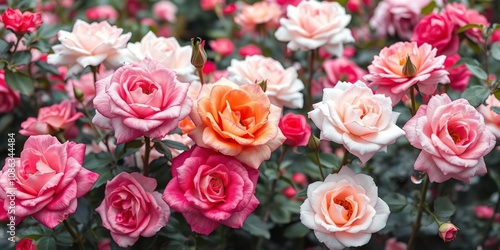 Blooming watercolor roses in a lush garden, serene atmosphere, soft brushstrokes