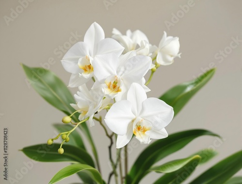 Blooming white vanilla orchid with delicate stamen and fresh leaves, agriculture, medicinal, extract, natural remedy