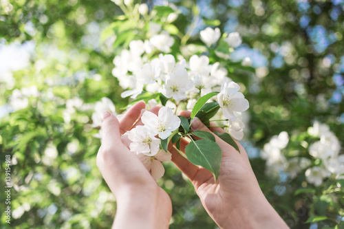 Blossoming apple branch in women's hands