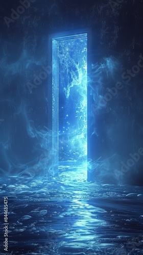 Blue abstract background, door slightly open, sunlight seeping in, representing opportunities and new beginnings.