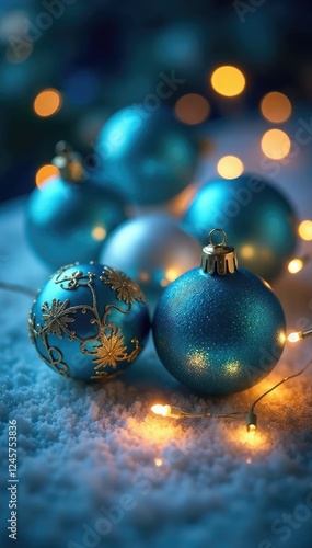 Blue and gold ornaments on a frosted glass table with Christmas lights, decorations, blue, lights