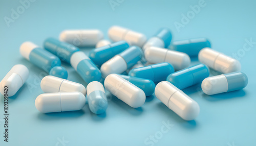 Blue and white capsule pills on gradient background. Global healthcare concept. Antibiotics drug resistance. Antimicrobial capsule pills. Pharmaceutical industry. Pharmacy products. Drug market isol