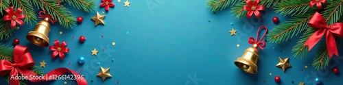Blue background featuring Christmas ornament elements like bells, stars, and flowers hung with ribbons and bows , winter, color scheme, decorative items