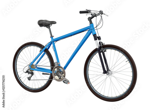 Blue bicycle, side front view. Black leather saddle and handles. Png clipart isolated on transparent background