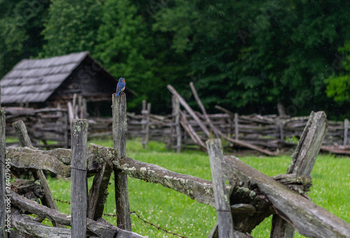 Blue Bird Perched On Old Fence During Rain