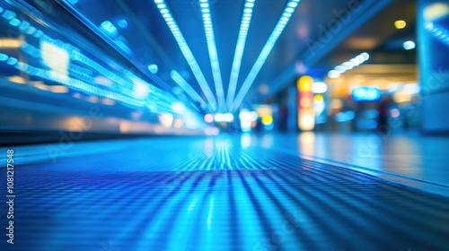 Blue, blurred background of the airport floor with an escalator in focus.