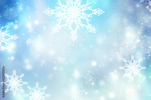 Blue blurred winter snowflakes background,christmas backdrop.