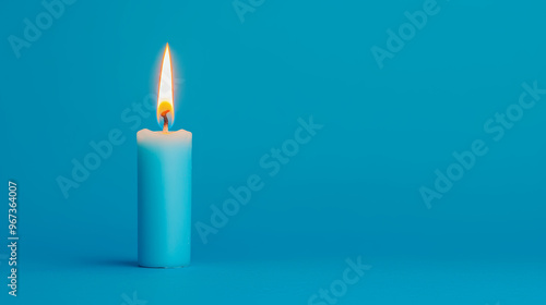 Blue candle burning with a vibrant flame on a blue background, symbolizing warmth, tranquility, and relaxation