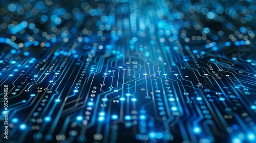 Blue circuit board illuminated by lights symbolizes technology, connectivity, innovation in a digital world