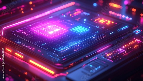 Blue computer circuit board with electronic chips and hardware components represents digital technology and electrical engineering