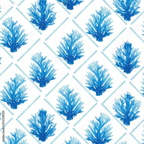 Blue Coral Watercolor Pattern seamless white ocean marine underwater background texture fabric textile wallpaper wrapping paper art