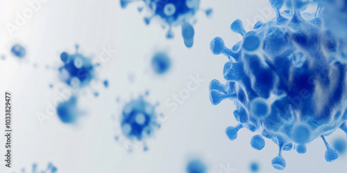 Blue Covid, respiratory virus molecules, on a white background, in the air. Banner template 3d seasonal flu, rotavirus, pandemic and epidemic formation, advertising and news