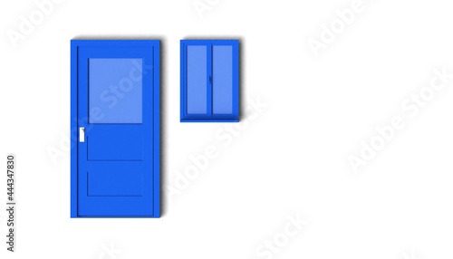 Blue door and window on neutral white background. 3D illustration. Minimal and interior concept. Modern.