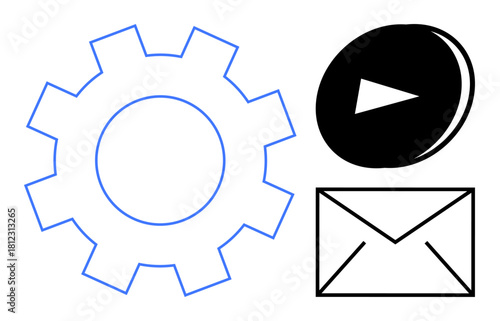Blue gear, black play button, and envelope outline symbolizing technology, communication, and media. Ideal for productivity, online tools, updates automation innovation connectivity. Simple flat