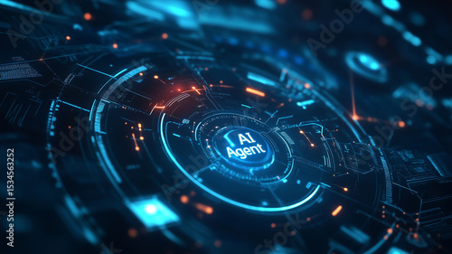 Blue glowing AI interface with the words AI agent, futuristic cyber elements floating in a virtual space, digital holograms and data flow