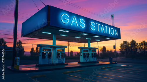 Blue glowing gas station text sign on petroleum building in the evening or night dark. Exterior view, industry business service