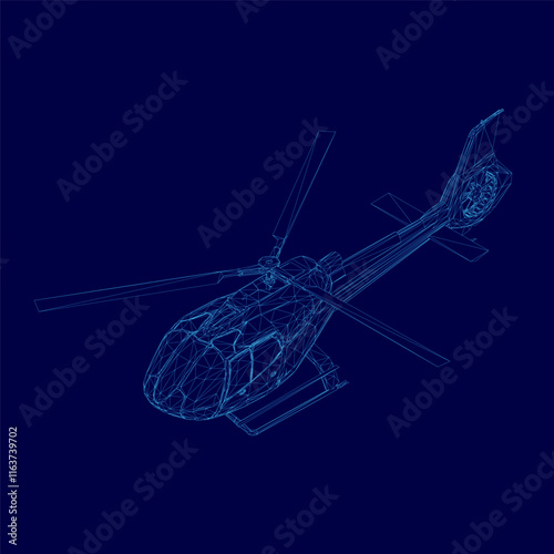 Blue helicopter is shown in a blue background. The image is a stylized drawing of a helicopter, with the blue color dominating the scene. Scene is calm and serene