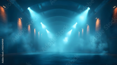 Blue Light Beams in Smoke Filled Room 3D Illustration
