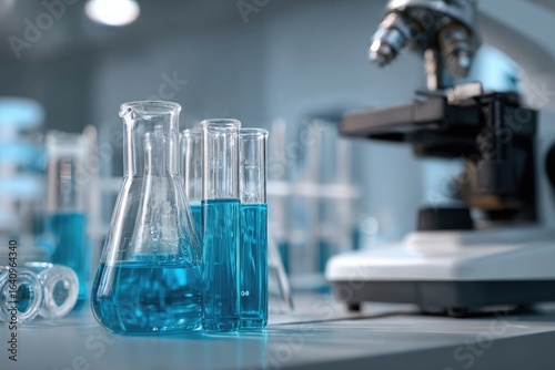 Blue liquid in lab glassware, microscope in background