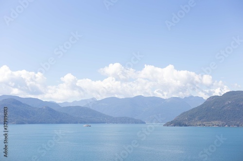 Blue mountains, lake and clouds in Vancouver, British Columbia