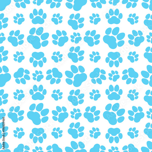 Blue paw print seamless repeating background pattern. Cat or dog footprints. Vector illustration.