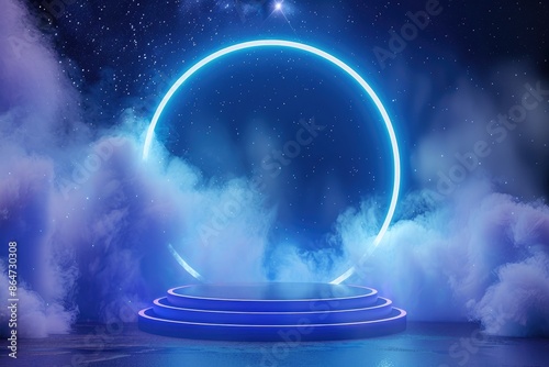 Blue Podium With Glowing Ring and Clouds Under a Starry Night