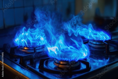Blue Propane Flame. The Power of Natural Gas for Home Stove. Flames and Energy in Blue Fire