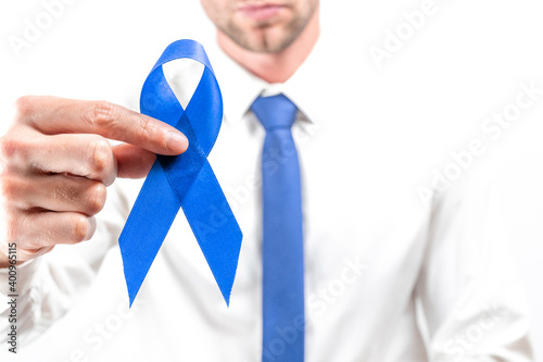 Blue prostate ribbon. Awareness cancer of men health. Hipster men in bright shirt, cyan tie with blue ribbon in hands on white background. November and International Mens Day.