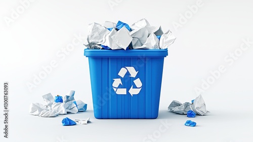 Blue Recycling Bin Overflowing with Paper Waste on Clean White Background