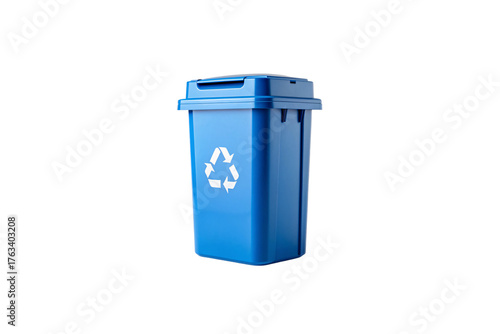 Blue recycling bin with white recycling symbol, compact size with hinged lid for waste sorting, isolated on a transparent background