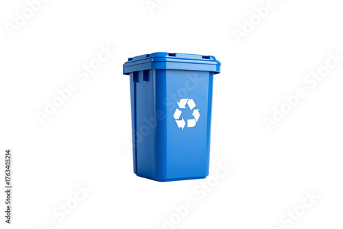 Blue recycling container with white recycling symbol, medium size with fitted lid for household use, isolated on a transparent background