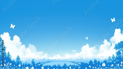 Blue Sky Landscape with Clouds, Butterflies, and Flowers