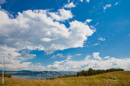 Blue sky with white clouds, trees, fields and meadows with green grass, against the mountains. Composition of nature. Rural summer landscape.