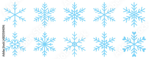 Blue snowflake icon set isolated vector illustration. Winter snow icon holidays. Symbol of frosty whether and happy divider Vector illustration. Snowflake different icons. Blue doodle snowflakes set.