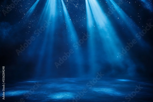 Blue stage spotlights, smoke, dark background.