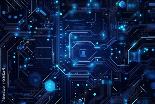 Blue technology background with circuit board elements, a blue vector illustration of a futuristic digital network connection and data transfer concept on a dark blue background