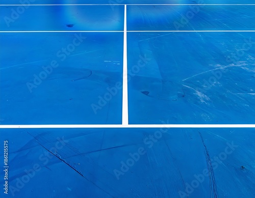 Blue tennis court surface with white lines marking sections and court dimensions during bright daylight