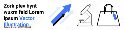 Blue upward arrows showing growth, a scientific microscope, and a shopping bag with a tag. Ideal for science, business, innovation, research, retail e-commerce education. Flat landing page banner