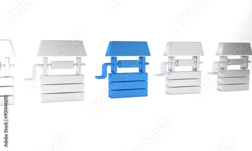Blue Well with a bucket and drinking water icon isolated on white background. Minimalism concept. 3D render illustration