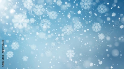 Blue winter background with falling snowflakes. Soft falling snowflakes illuminate a serene winter landscape with gentle light