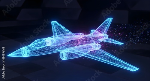 Blue wireframe fighter jet with glowing particles against a dark background aircraft