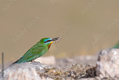 Blue-cheeked Bee-eater, Merops persicus on a rock with prey in its mouth.