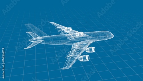 Blueprint Design of Commercial Airplane on Grid Background in Blue