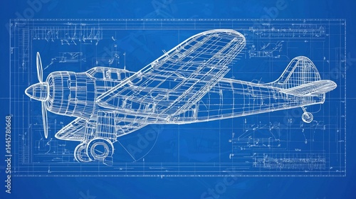 Blueprint rendering of an aircraft against a blue backdrop