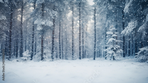 blur white snow and pine forest winter background. Christmas and new year backdrop for festive seasonal decoration