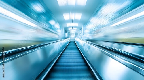 blurred background metro escalator / light blue background movement city infrastructure subway.