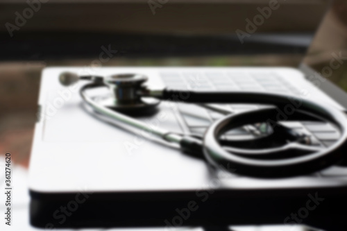 Blurred image of medical stethoscope and laptop computer isolated on dark table background with reflection. Medic tech, online medical, emr, telehealth concept.
