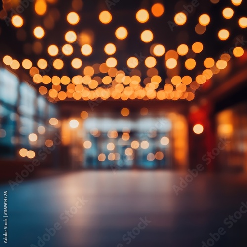 Blurred interior with warm lighting and bokeh effect.