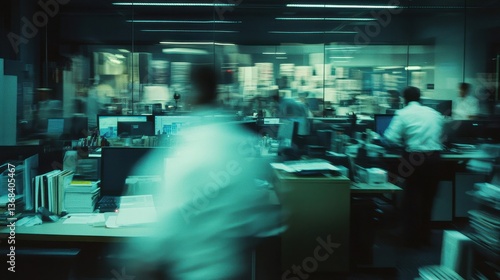 Blurred office environment with workers in their respective work areas