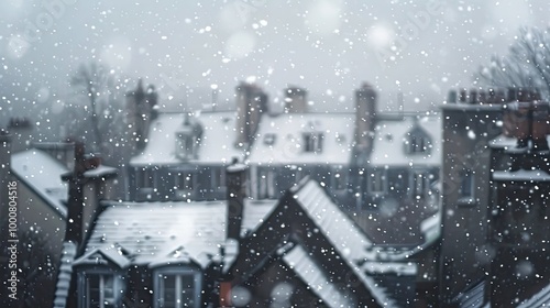 Blurred snow-covered rooftops seen through light snowfall evoking winter calm